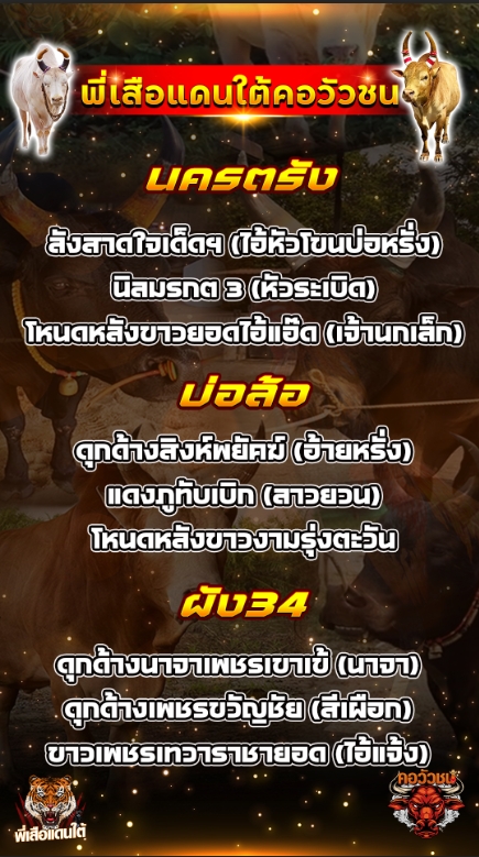 ทีเด็ดวัวชน วันที่11/02/69 สนามชนโคตรัง-บ่อล้อ-ผัง34