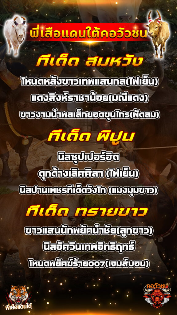 ทีเด็ดวัวชน วันที่27/11/68 สนามชนโคพิปูน-สมหวัง-ทรายขาว