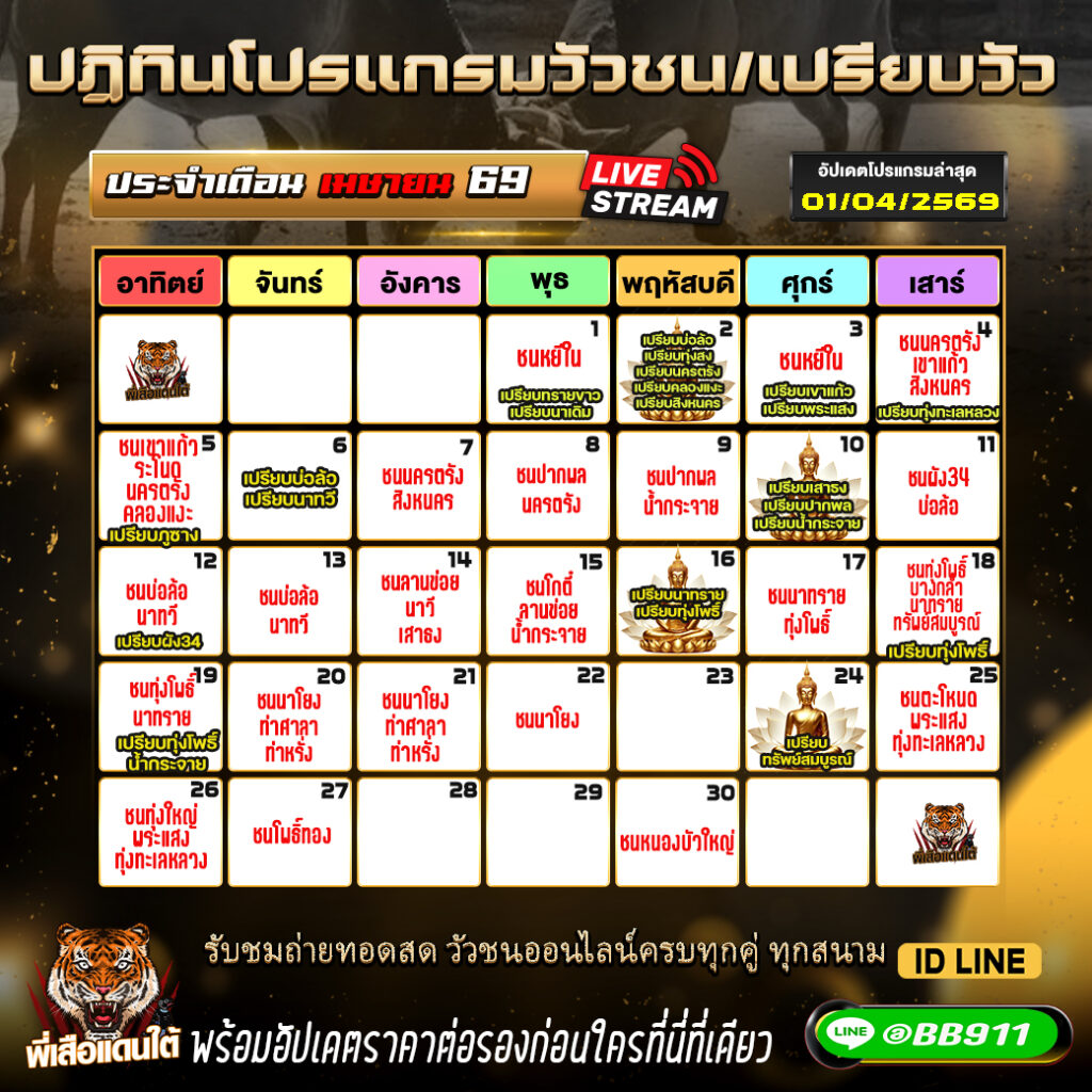 ปฎิทินวัวชน ประจำเดือนเมษายน 2569