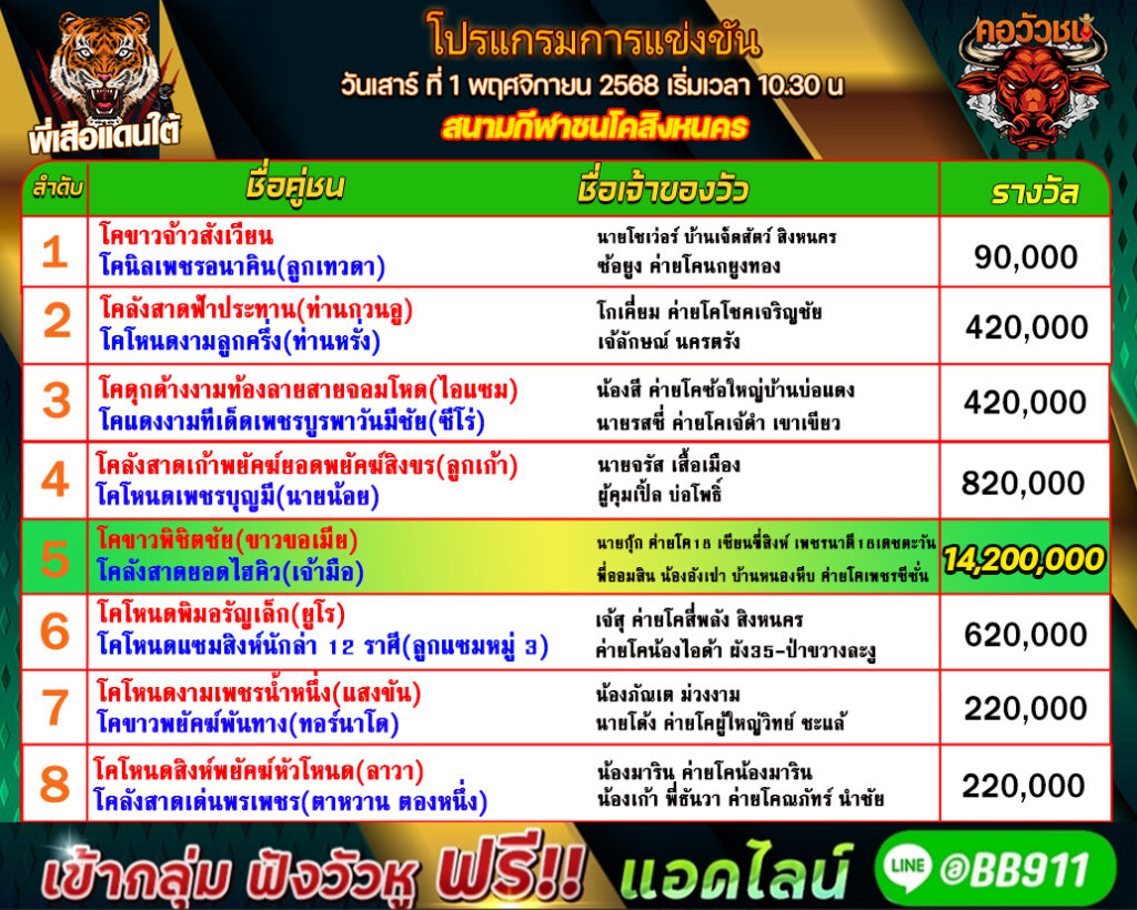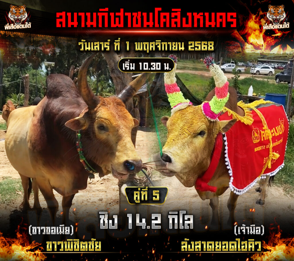 โปรแกรมวัวชน วันที่01/11/68 สนามชนโคสิงหนคร
