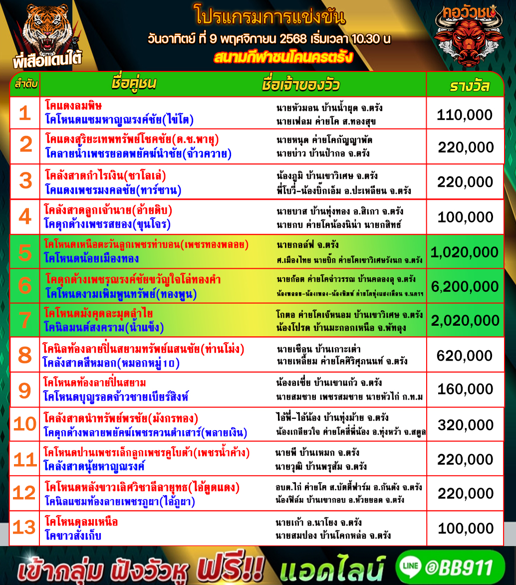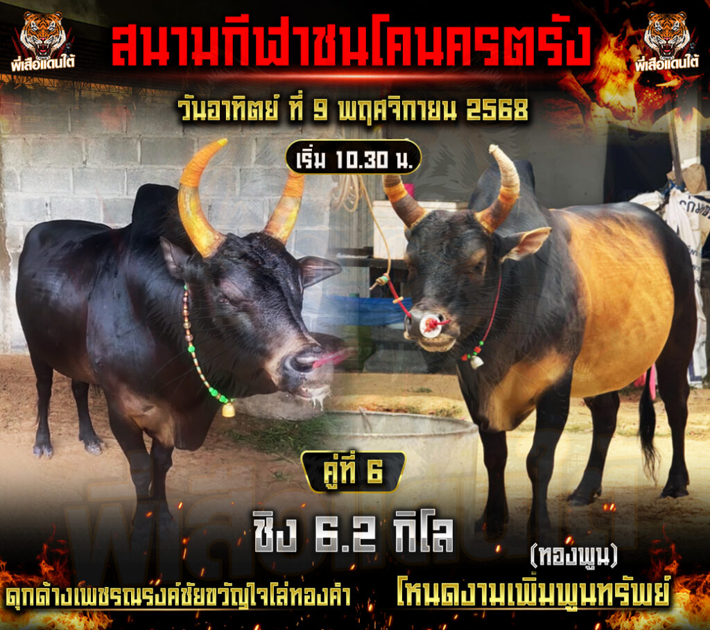 โปรแกรมวัวชน วันที่09/11/68 สนามชนโคนครตรัง