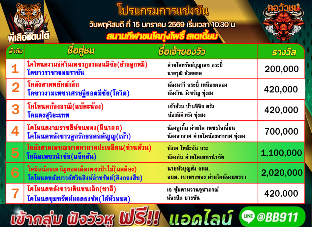 โปรแกรมวัวชน วันที่15/01/69 สนามชนโคเสาธง สเตเดี๊ยม