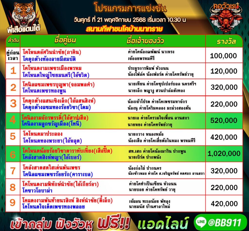 โปรแกรมวัวชน วันที่21/11/68 สนามชนโคบ้านนาทราย