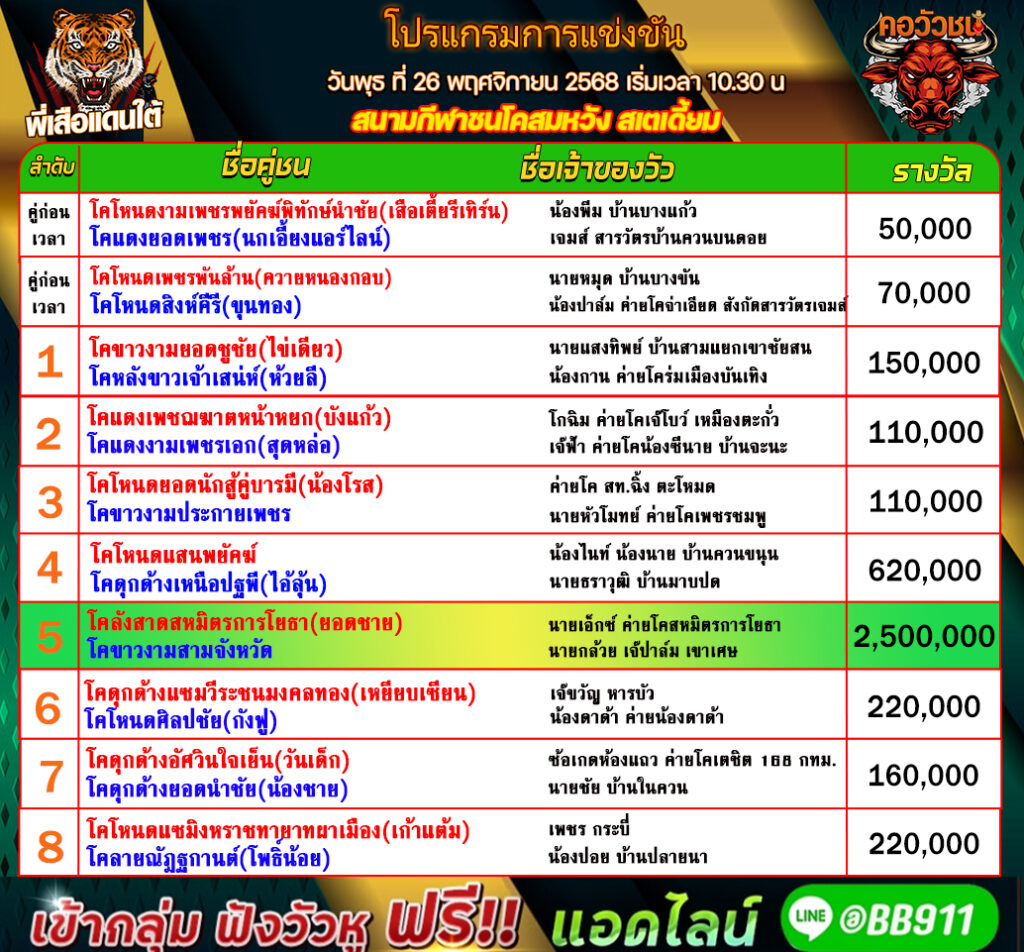 โปรแกรมวัวชน วันที่26/11/68 สนามชนโคสมหวัง สเตเดี๊ยม