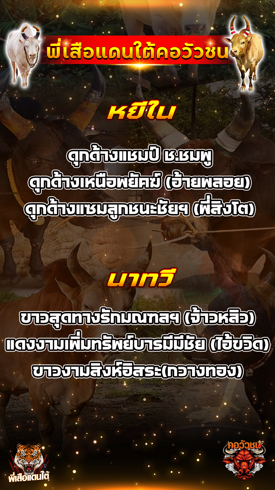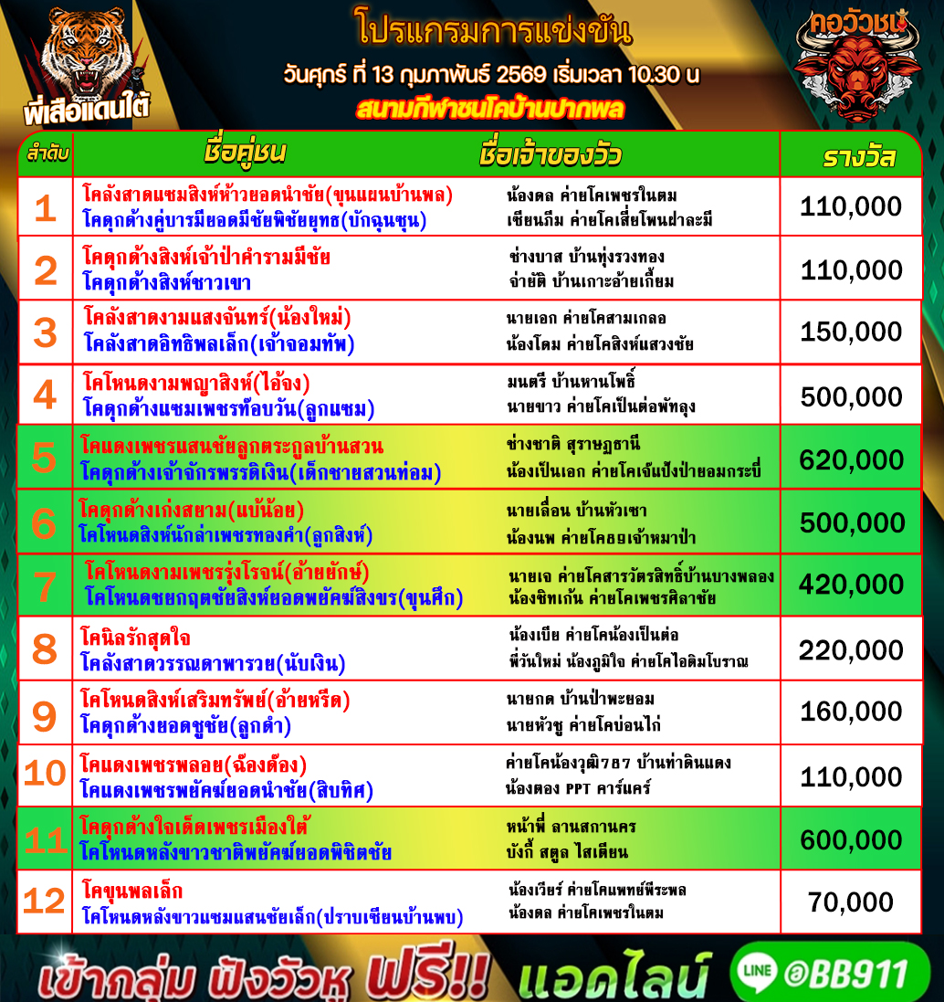 โปรแกรมวัวชน วันที่13/02/69 สนามชนโคปากพล เข้าเล่นวัวชนสด คลิ๊กhttps://line.me/R/ti/p/@bb911 หรือ@BB911 มีตัว@ข้างหน้ากันนะครับ admin03 12 กุมภาพันธ์ 2026