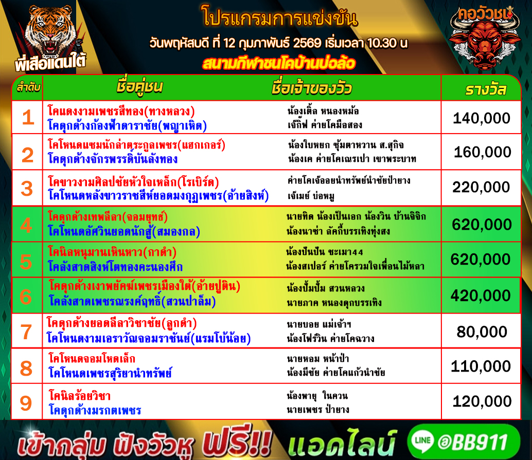 โปรแกรมวัวชน วันที่12/02/69 สนามชนโคบ่อล้อ คู่เอก เข้าเล่นวัวชนสด คลิ๊กhttps://line.me/R/ti/p/@bb911 หรือ@BB911 มีตัว@ข้างหน้ากันนะครับ admin03 11 กุมภาพันธ์ 2026