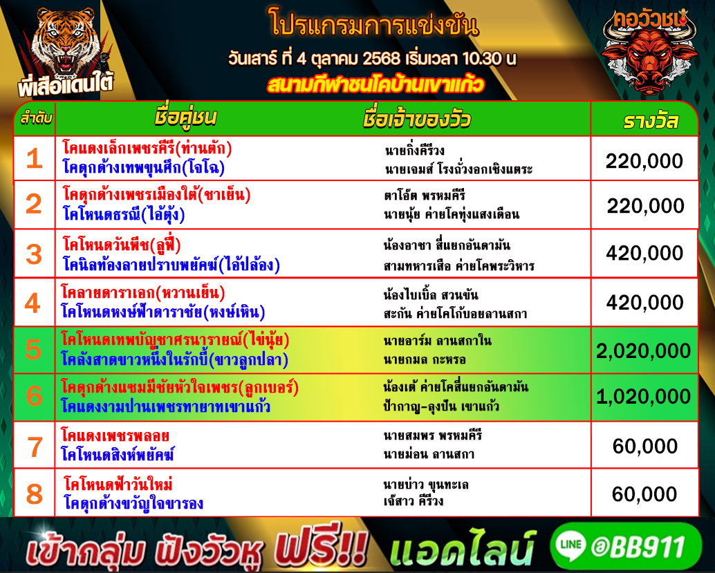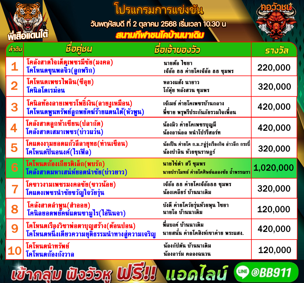 โปรแกรมวัวชน วันที่02/10/68 สนามชนโคบ้านนาเดิม เข้าเล่นวัวชนสด คลิ๊กhttps://lin.ee/fZLVpK6 หรือ@BB911 มีตัว@ข้างหน้ากันนะครับ admin03 2 ตุลาคม 2025