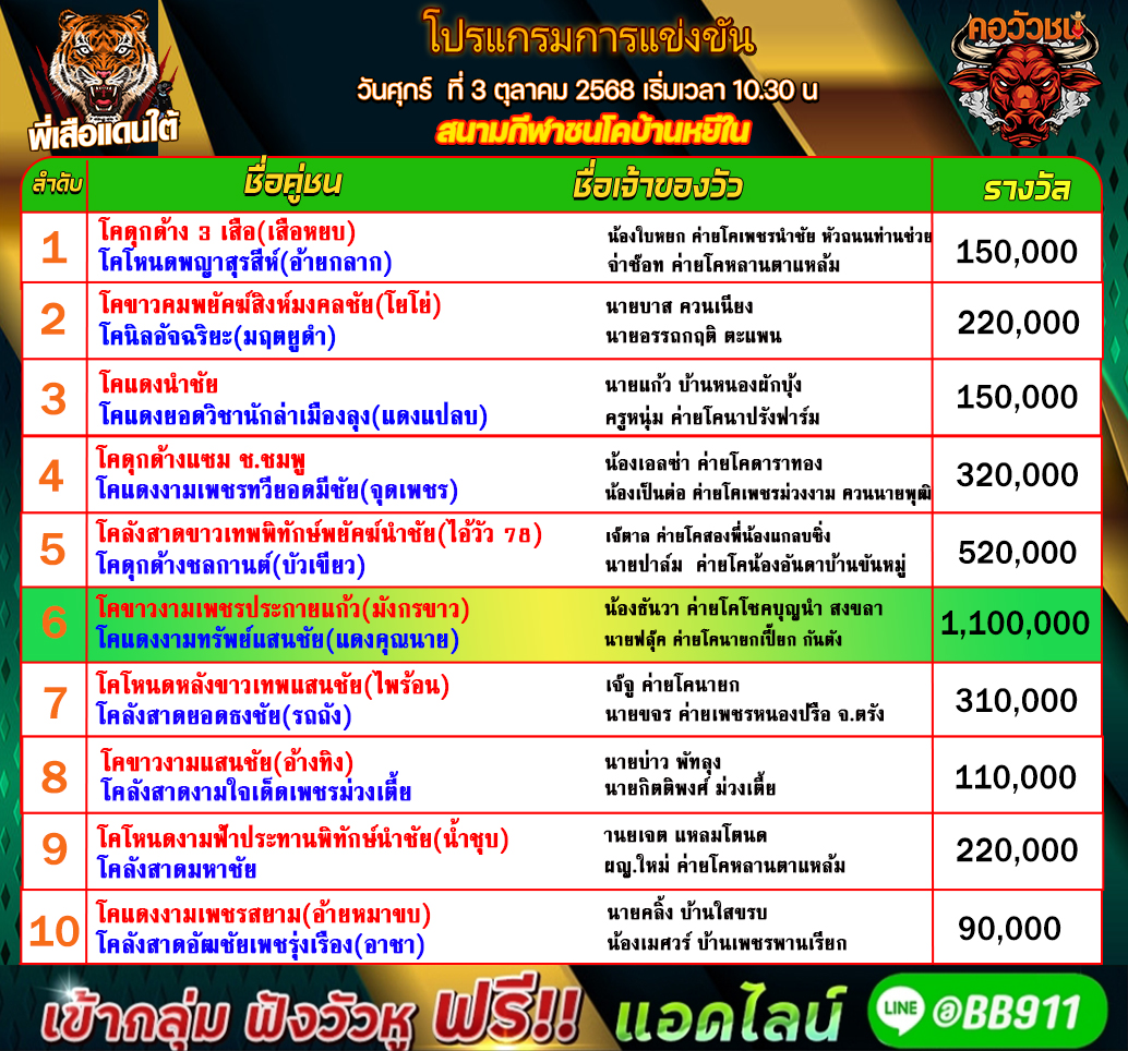 ทีเด็ดวัวชน วันที่03/10/68 สนามชนโคบ้านหยีใน เข้าเล่นวัวชนสด คลิ๊กhttps://lin.ee/fZLVpK6 หรือ@BB911 มีตัว@ข้างหน้ากันนะครับ admin03 3 ตุลาคม 2025