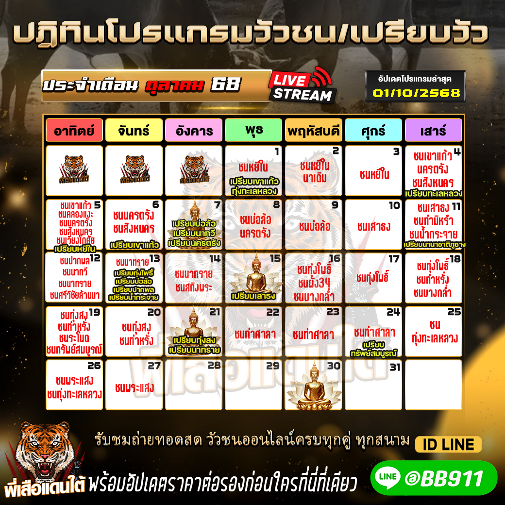 ปฎิทินวัวชน ประจำเดือนตุลาคม 2568 วัวชน โปรแกรมวัวชน ทุกสนาม ประจำเดือนตุลาคมคม 2568 เข้าเล่นวัวชนสด คลิ๊กhttps://lin.ee/fZLVpK6 หรือ@BB911 มีตัว@ข้างหน้ากันนะครับ admin03 1 ตุลาคม 2025