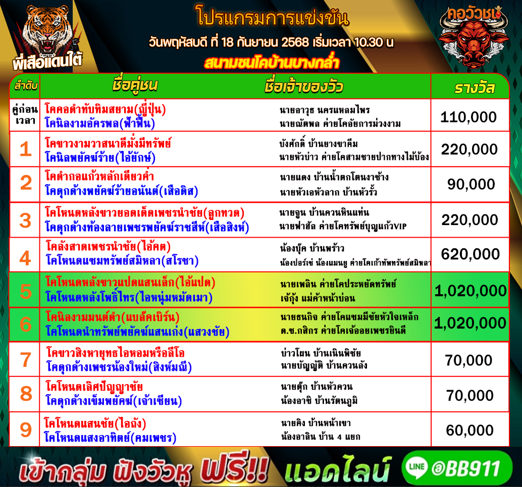 โปรแกรมวัวชน วันที่18/09/68 สนามชนโคบ้านบางกล่ำ คู่เอก เข้าเล่นวัวชนสด คลิ๊กhttps://lin.ee/fZLVpK6 หรือ@BB911 มีตัว@ข้างหน้ากันนะครับ admin03 17 กันยายน 2025