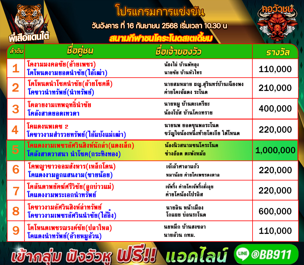 ทีเด็ดวัวชน วันที่16/09/68 สนามชนโคบ้านระโนด+ทุ่งสง ซิตี้ เข้าเล่นวัวชนสด คลิ๊กhttps://lin.ee/fZLVpK6 หรือ@BB911 มีตัว@ข้างหน้ากันนะครับ admin03 16 กันยายน 2025