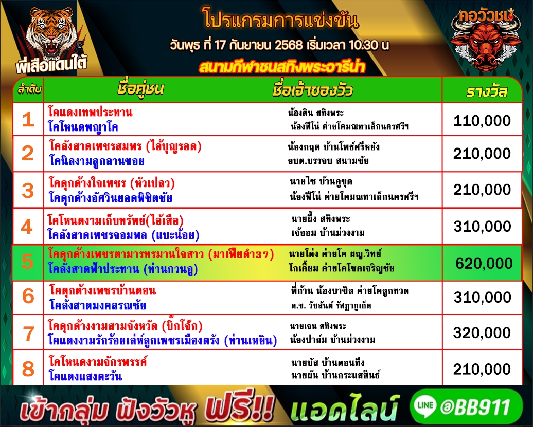 โปรแกรมวัวชน วันที่14/09/68 สนามชนโคบ้านปากพล คู่เอก เข้าเล่นวัวชนสด คลิ๊กhttps://lin.ee/fZLVpK6 หรือ@BB911 มีตัว@ข้างหน้ากันนะครับ admin03 13 กันยายน 2025