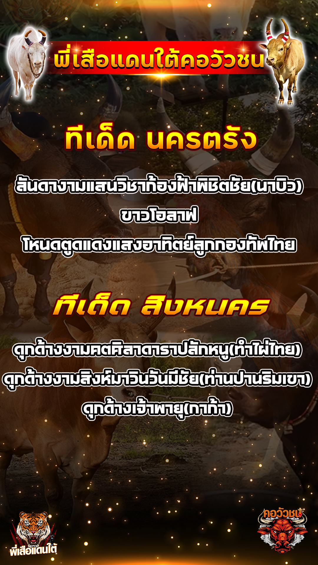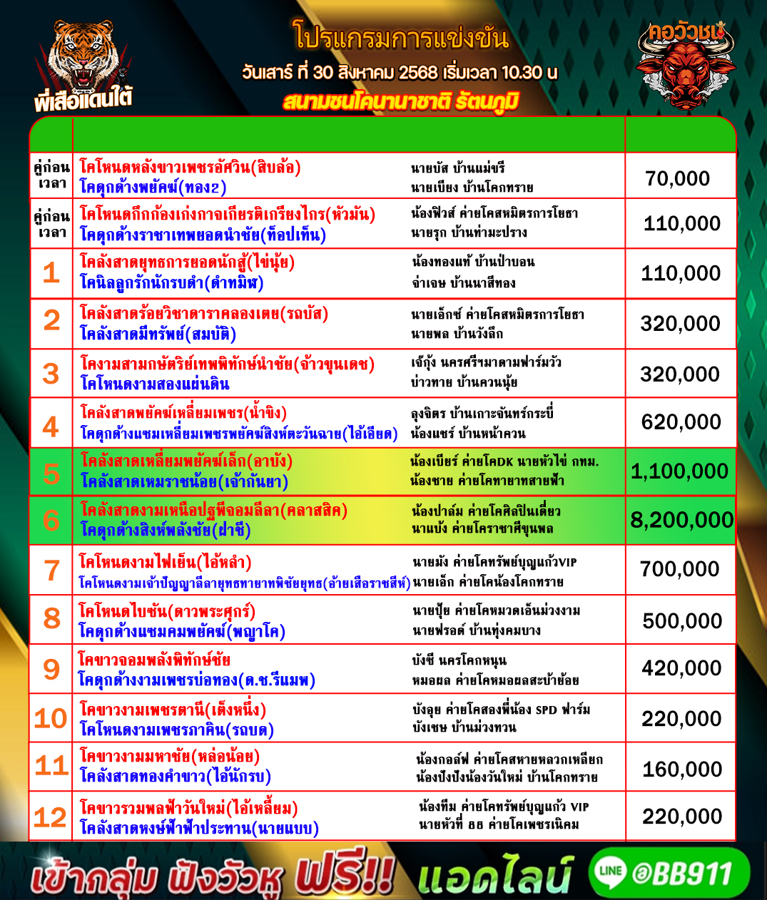 โปรแกรมวัวชน วันที่30/08/68 สนามชนโคทุ่งทะเลหลวง คู่เอก เข้าเล่นวัวชนสด คลิ๊กhttps://lin.ee/fZLVpK6 หรือ@BB911 มีตัว@ข้างหน้ากันนะครับ admin03 30 สิงหาคม 2025