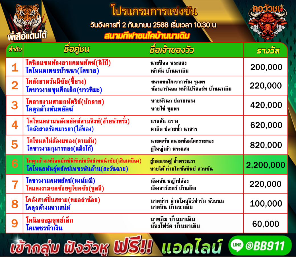 ทีเด็ดวัวชน วันที่01/09/68 สนามชนโคบ้านหยีใน เข้าเล่นวัวชนสด คลิ๊กhttps://lin.ee/fZLVpK6 หรือ@BB911 มีตัว@ข้างหน้ากันนะครับ admin03 1 กันยายน 2025
