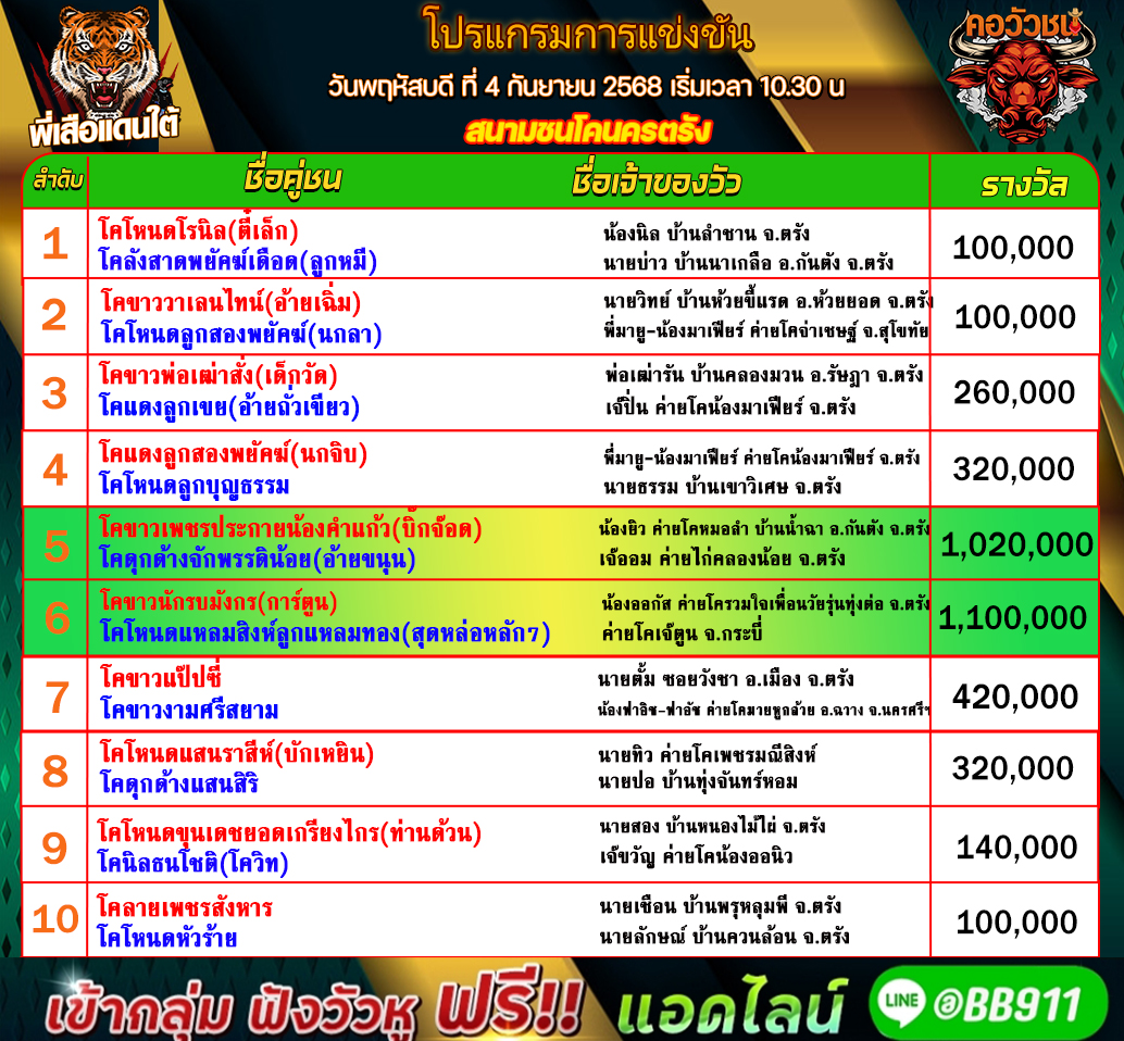 โปรแกรมวัวชน วันที่06/09/68 สนามชนโคนครตรัง คู่ถอน เข้าเล่นวัวชนสด คลิ๊กhttps://lin.ee/fZLVpK6 หรือ@BB911 มีตัว@ข้างหน้ากันนะครับ admin03 6 กันยายน 2025