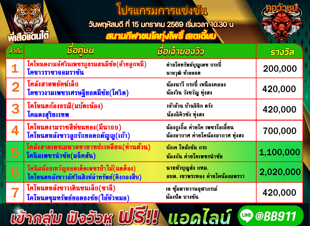 โปรแกรมวัวชน วันที่15/01/69 สนามชนโคเสาธง สเตเดี๊ยม คู่เอก เข้าเล่นวัวชนสด คลิ๊กhttps://line.me/R/ti/p/@bb911 หรือ@BB911 มีตัว@ข้างหน้ากันนะครับ admin03 14 มกราคม 2026