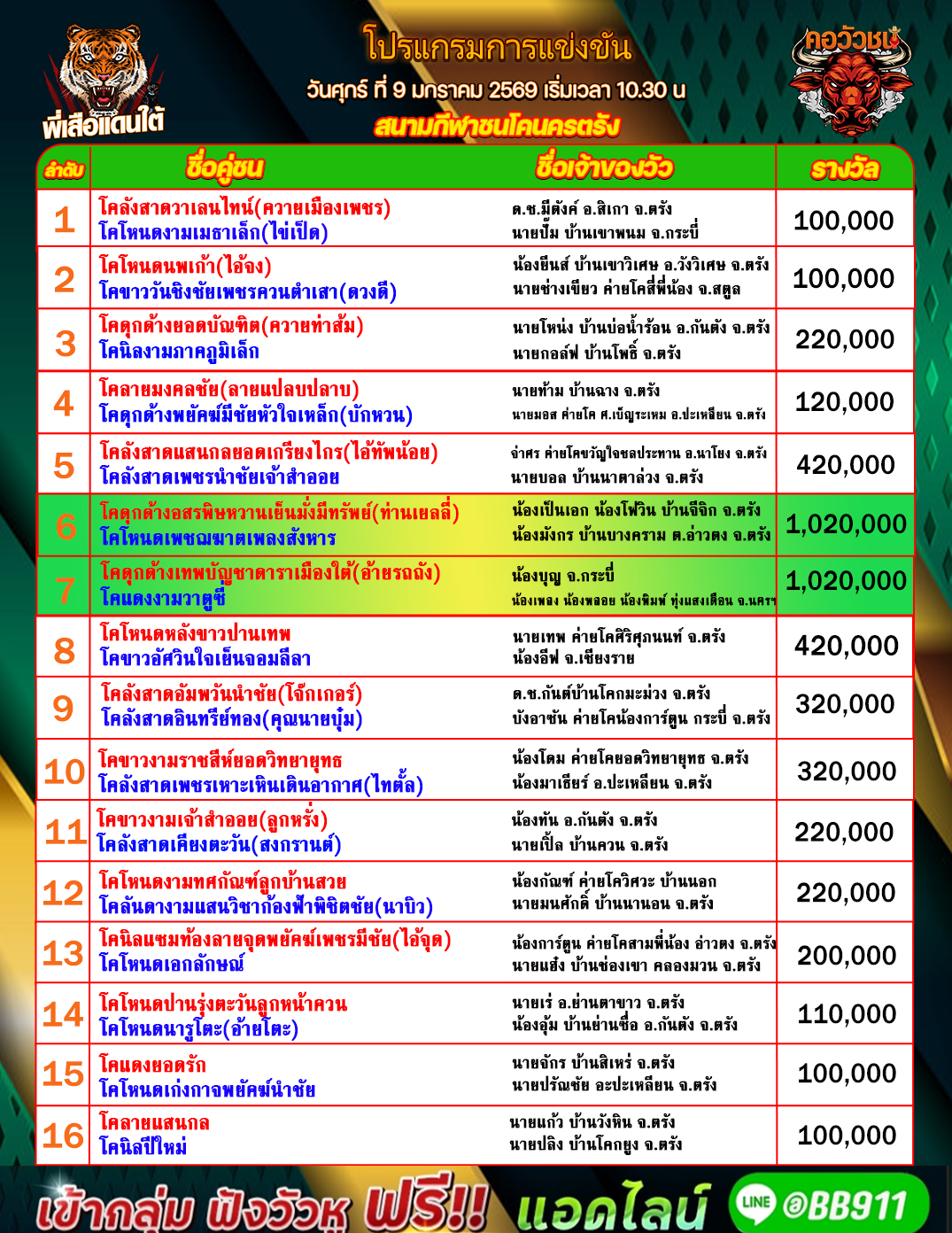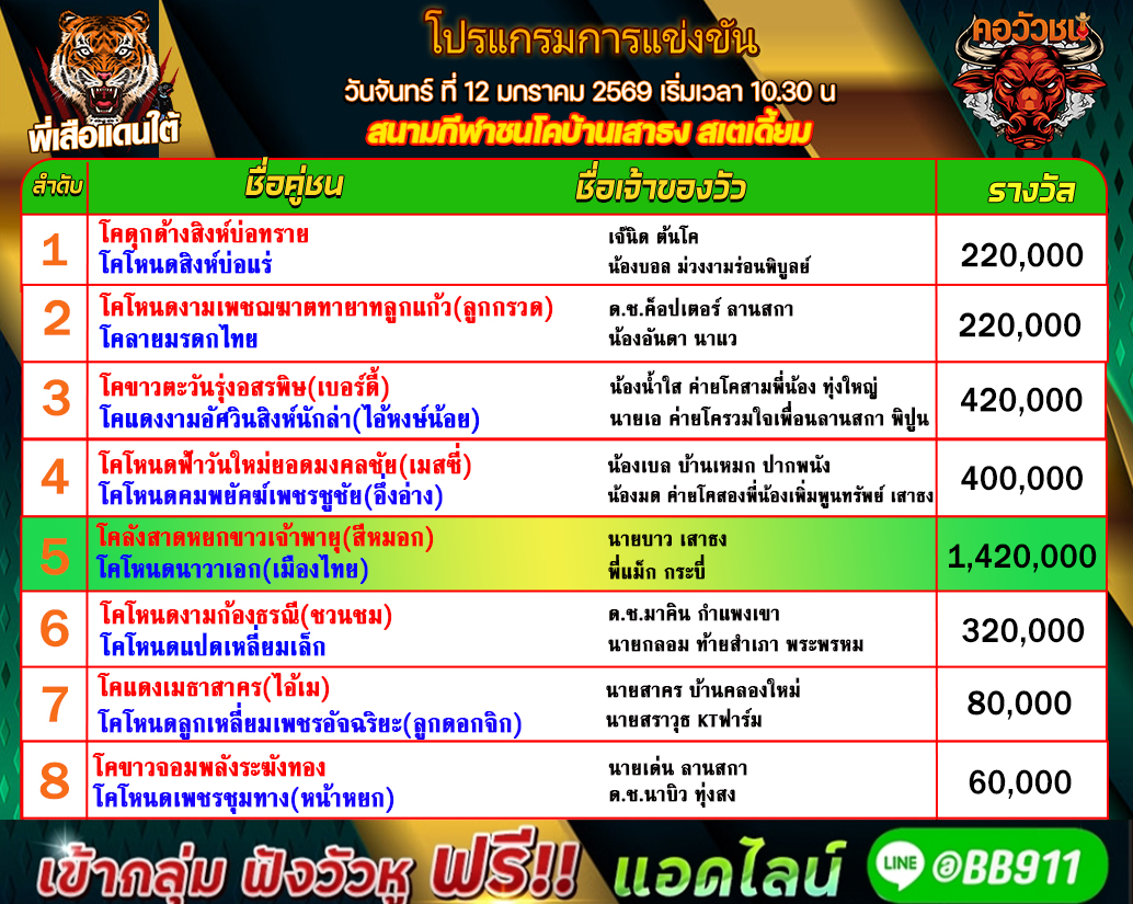 โปรแกรมวัวชน วันที่12/01/69 สนามชนโคเสาธง สเตเดี๊ยม คู่เอก เข้าเล่นวัวชนสด คลิ๊กhttps://line.me/R/ti/p/@bb911 หรือ@BB911 มีตัว@ข้างหน้ากันนะครับ admin03 11 มกราคม 2026