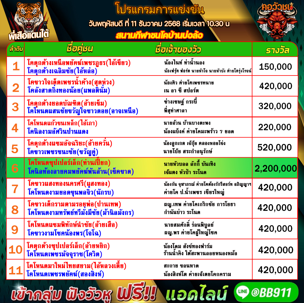โปรแกรมวัวชน วันที่11/12/68 สนามชนโคบ่อล้อ คู่เอก เข้าเล่นวัวชนสด คลิ๊กhttps://lin.ee/fZLVpK6 หรือ@BB911 มีตัว@ข้างหน้ากันนะครับ admin03 11 ธันวาคม 2025