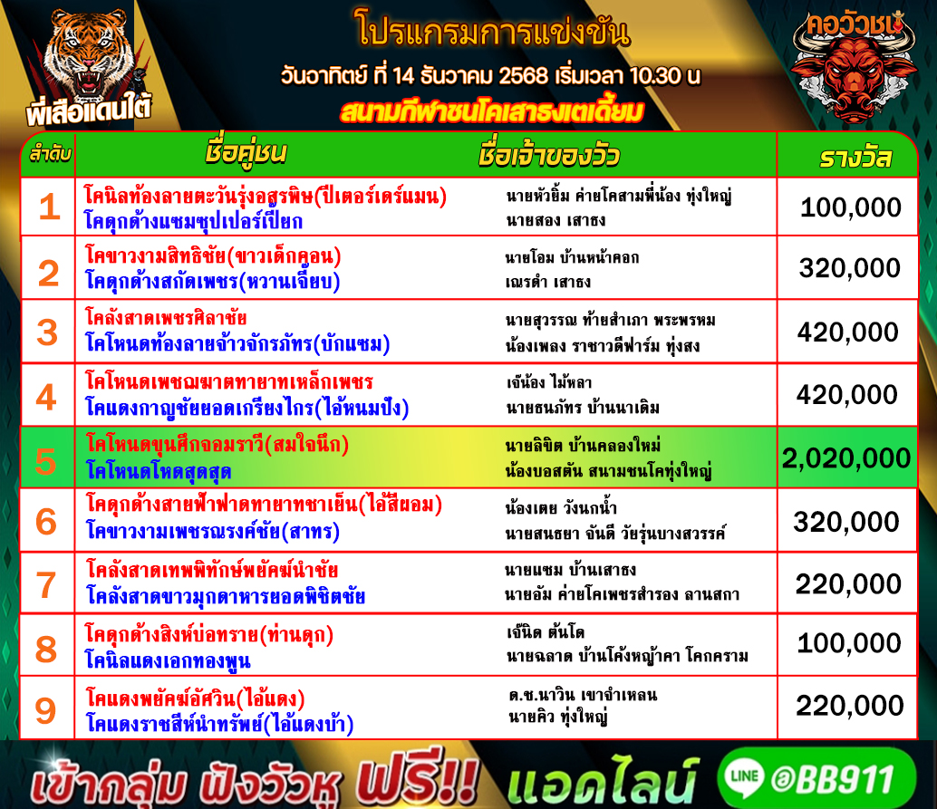 โปรแกรมวัวชน วันที่14/12/68 สนามชนโคเสาธง สเตเดี๊ยม คู่เอก เข้าเล่นวัวชนสด คลิ๊กhttps://lin.ee/fZLVpK6 หรือ@BB911 มีตัว@ข้างหน้ากันนะครับ admin03 14 ธันวาคม 2025