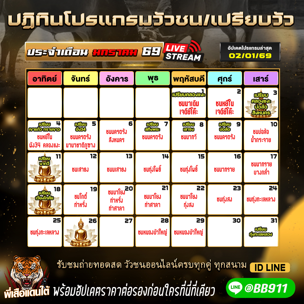 ปฎิทินวัวชน ประจำเดือนมกราคม 2569 วัวชน โปรแกรมวัวชน ทุกสนาม ประจำเดือนธันวาคม 2568 เข้าเล่นวัวชนสด คลิ๊กhttps://lin.ee/fZLVpK6 หรือ@BB911 มีตัว@ข้างหน้ากันนะครับ admin03 5 มกราคม 2026