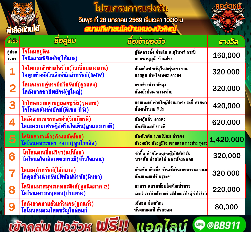 โปรแกรมวัวชน วันที่28/01/69 สนามชนโคบ้านหนองบัวใหญ่ คู่เอก เข้าเล่นวัวชนสด คลิ๊กhttps://line.me/R/ti/p/@bb911 หรือ@BB911 มีตัว@ข้างหน้ากันนะครับ admin03 27 มกราคม 2026