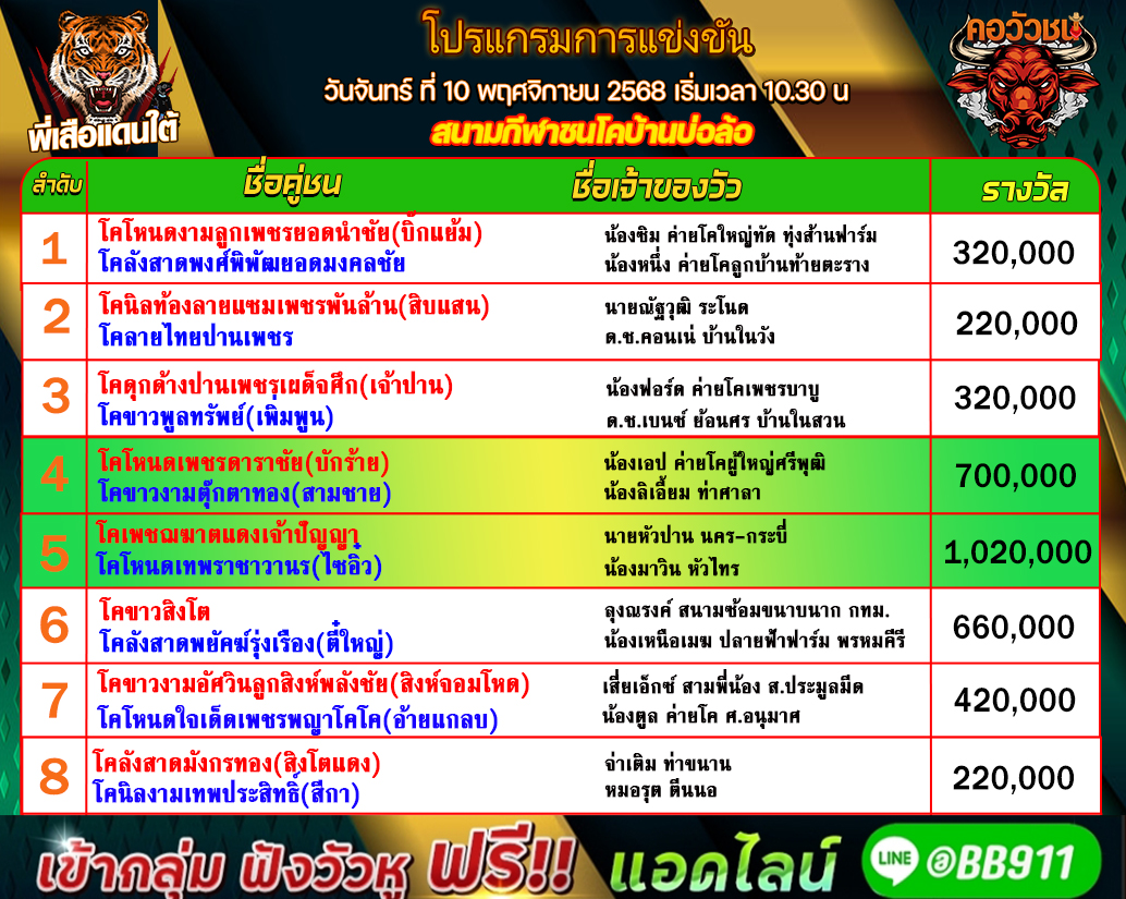 ทีเด็ดวัวชน วันที่11/11/68 สนามชนโคบ้านบ่อล้อ-อุใดเจริญ เข้าเล่นวัวชนสด คลิ๊กhttps://lin.ee/fZLVpK6 หรือ@BB911 มีตัว@ข้างหน้ากันนะครับ admin03 11 พฤศจิกายน 2025