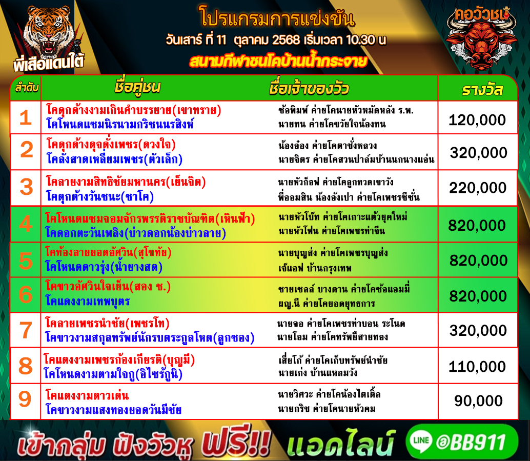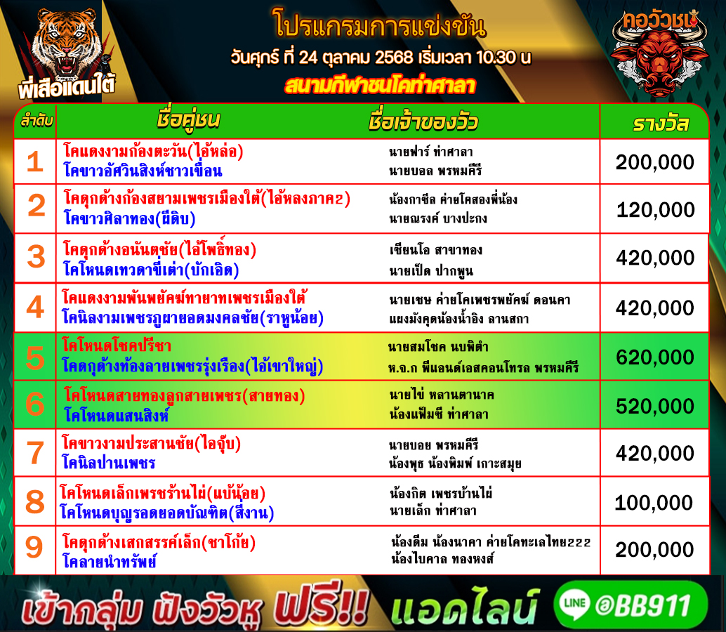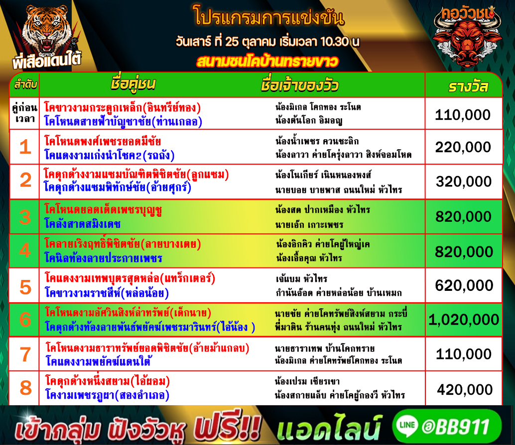 โปรแกรมวัวชน วันที่25/10/68 สนามชนโคบ้านทรายขาว คู่เอก เข้าเล่นวัวชนสด คลิ๊กhttps://lin.ee/fZLVpK6 หรือ@BB911 มีตัว@ข้างหน้ากันนะครับ admin03 24 ตุลาคม 2025