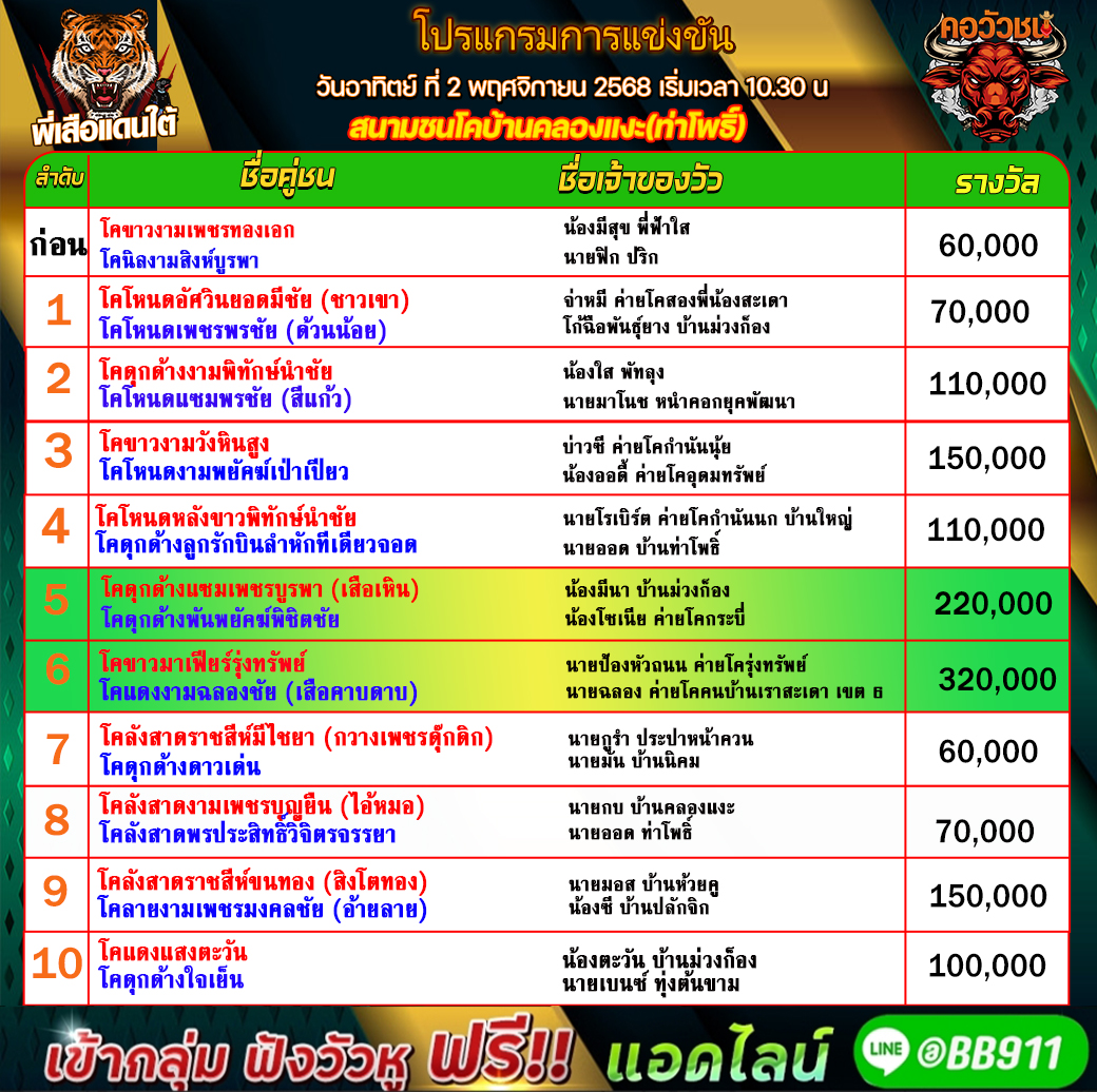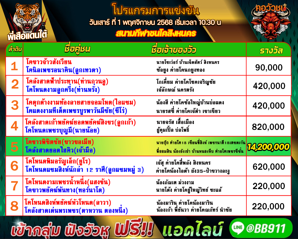 โปรแกรมวัวชน วันที่01/11/68 สนามชนโคสิงหนคร คู่เอก เข้าเล่นวัวชนสด คลิ๊กhttps://lin.ee/fZLVpK6 หรือ@BB911 มีตัว@ข้างหน้ากันนะครับ admin03 31 ตุลาคม 2025